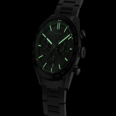 Индексы с родиевым покрытием и белым люминесцентным покрытием Super-LumiNova. Часовая и минутная стрелки с родиевым покрытием, белым покрытием Super-LumiNova и черным лаком. Центральная стрелка с родиевым покрытием. Логотип TAG HEUER с родиевым покрытием.